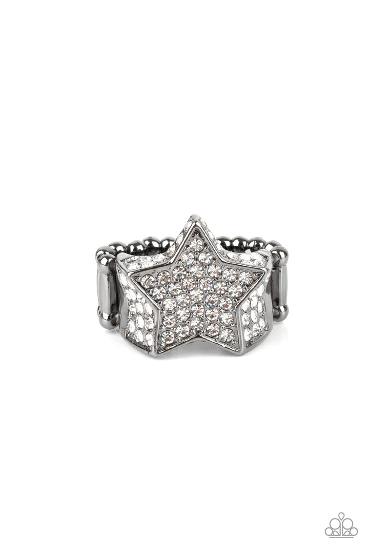 Encrusted in glittery white rhinestones, a sparkly gunmetal star joins with a thick band of blinding white rhinestones. The edges of the star are embellished in additional white rhinestones, creating a stellar centerpiece atop the finger. Features a stretchy band for a flexible fit.