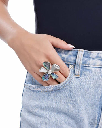 Featuring metallic silver and abalone shell petals, an oversized curled silver flower, with a silver-studded center, blooms atop an airy silver band for a whimsical finish. Features a stretchy band for a flexible fit.