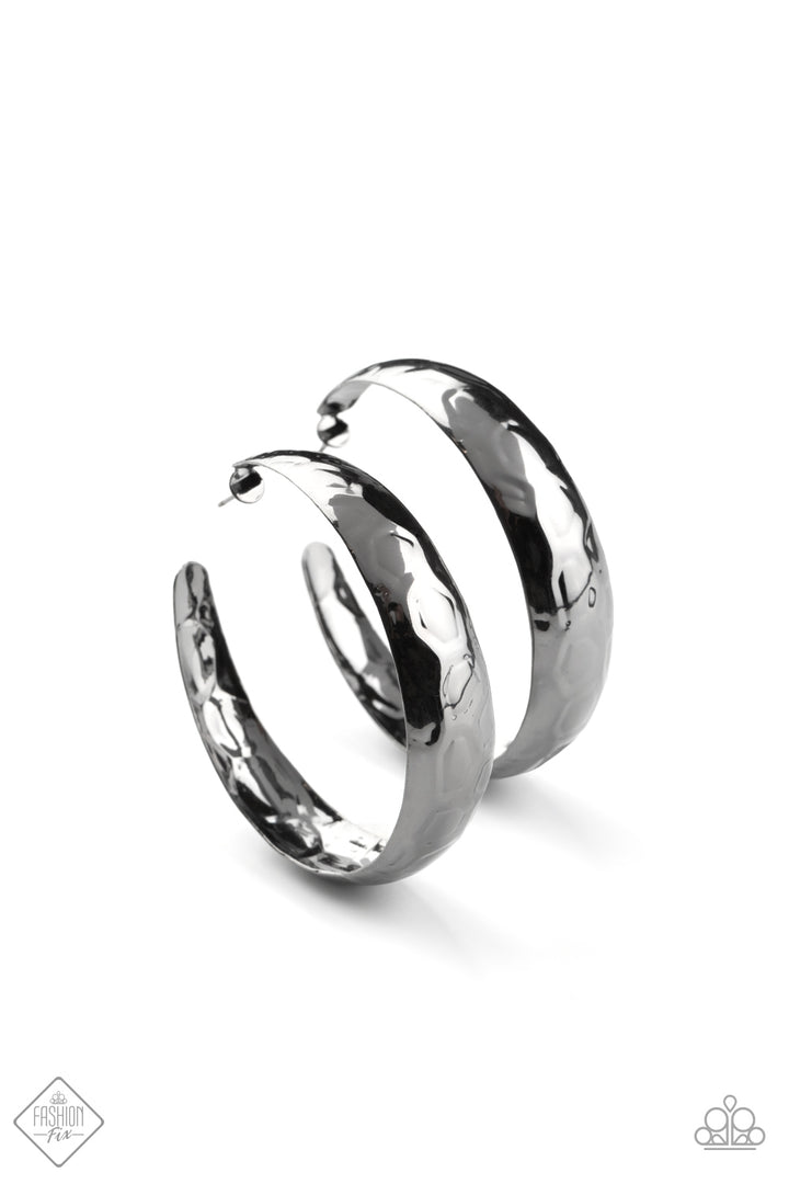 Hammered in blinding shimmer, a thick gunmetal hoop curls into a gritty-glamorous display with an exaggerated attitude. Earring attaches to a standard post fitting. Hoop measures approximately 2 1/2"" in diameter.