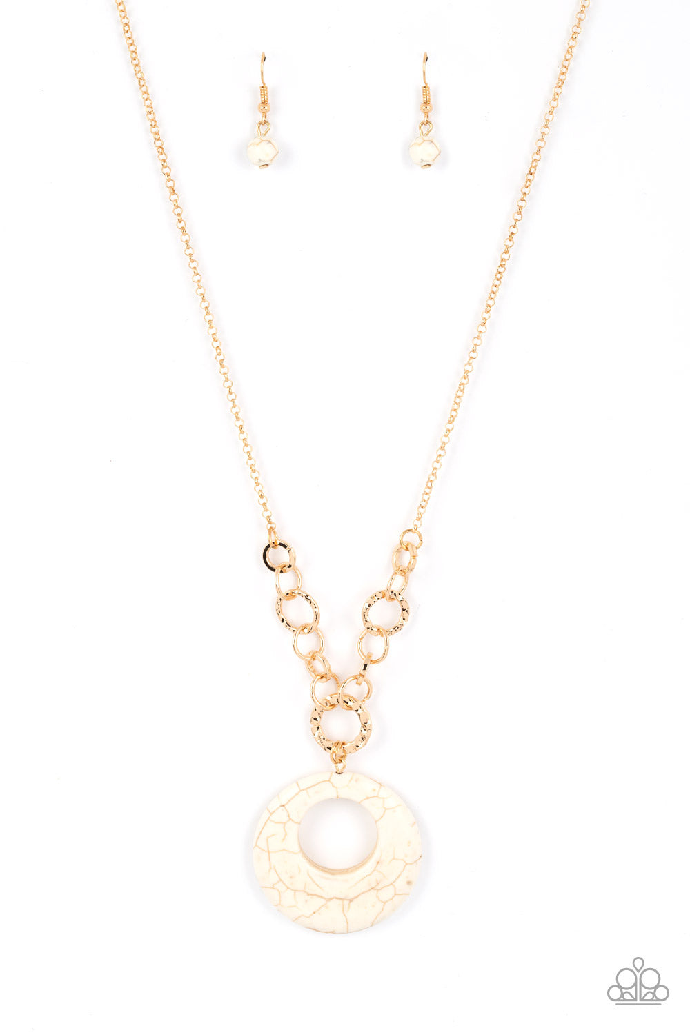 A mismatched collection of textured and smooth silver links gives way to an oversized white stone hoop at the bottom of an extended gold chain, resulting in an earthy centerpiece. Features an adjustable clasp closure.
