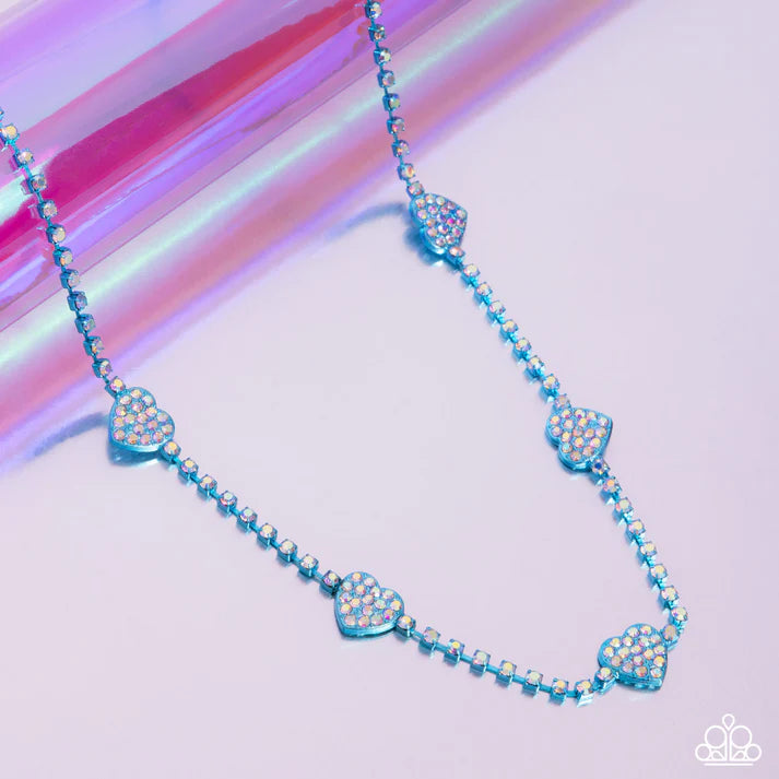 Set in metallic blue square fittings, a collection of dainty iridescent rhinestones loop around the neckline. Metallic blue hearts, also embellished with iridescent rhinestones, haphazardly interrupt the shimmery strand for a romantic finish. Features an adjustable clasp closure. Due to its prismatic palette, color may vary.