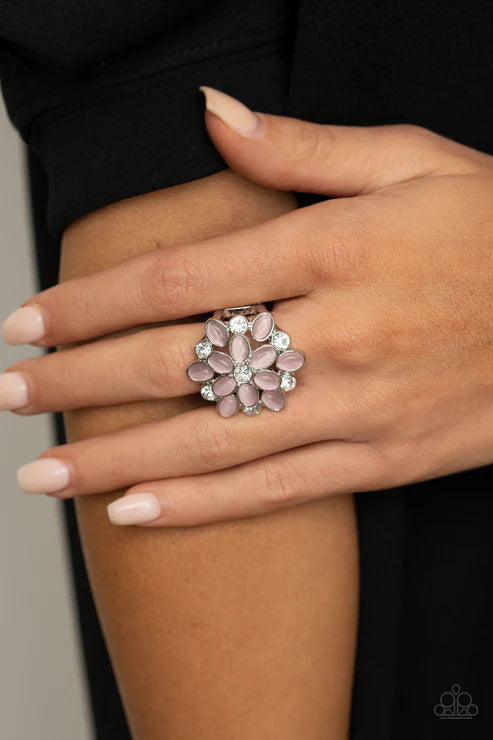 Layers of glassy white rhinestones and glowing pink cat's eye stone petals stack into a whimsically colorful floral centerpiece atop the finger. Features a stretchy band for a flexible fit.