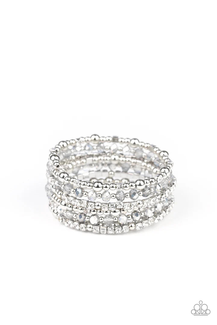 An icy collection of silver beads, silver cubes, metallic crystals, and glassy white rhinestones are threaded along a coiled wire, creating a blinding infinity wrap style bracelet around the wrist. Sold as one individual bracelet.