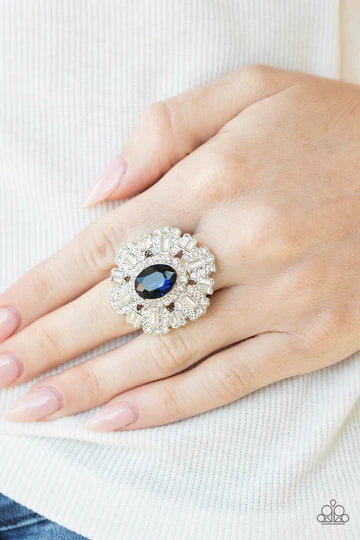 A sparkly series of round and emerald-cut rhinestone petals flare out from a blue oval rhinestone center, creating a dramatically oversized centerpiece atop the finger. Features a stretchy band for a flexible fit.