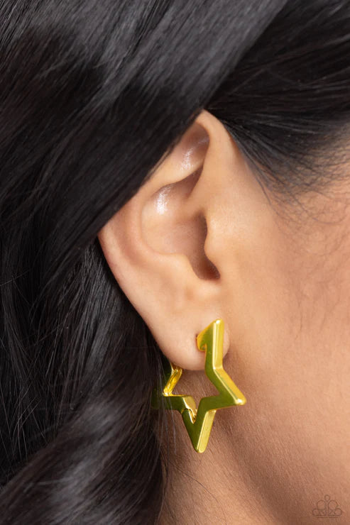 Dipped in an electric yellow shade, a three-dimensional star-shaped hoop hinges around the ear resulting in a stellar statement. Earring attaches to a standard hinge closure fitting. Hoop measures approximately 1 1/4" in diameter.