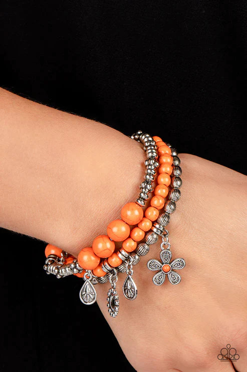 A trio of floral-inspired bracelets, featuring comfortable stretchy bands and smooth orange stones, stack along the wrist to create a bold statement piece. One bracelet is formed from a strand of linearly textured silver beads, leading to a single silver flower charm topped with a tiny orange stone. A strand of orange stones creates another bracelet that is adorned with three silver charms — two teardrops embossed with small flowers, and a polished disc bordered by silver studs. The final bracelet features sections of orange stones separated by textured silver accents, with a single airy leaf charm adding playful movement to the piece. As the stone elements in this piece are natural, some color variation is normal.