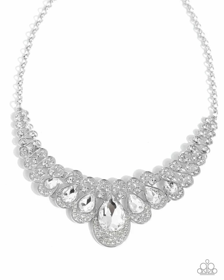 Pressed in thin, curly silver infinity-like frames, solitaire white rhinestones gradually elongate into faceted shimmery teardrop gems. A collection of dainty, airy white rhinestones dusts the caps of each teardrop frame for additional glitz and glamor. Features an adjustable clasp closure.