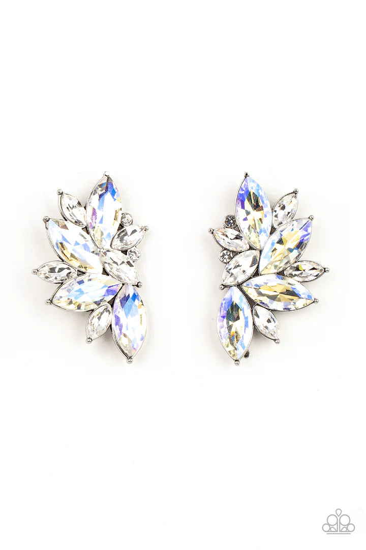 Infused with dainty white rhinestones, a stellar display of iridescent and white marquise cut rhinestones fan out into a spectacular centerpiece. Earring attaches to a standard post fitting.