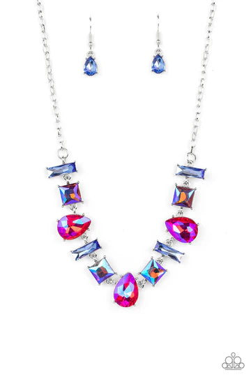 Iridescent teardrop gems join princess and emerald cut gems below the collar for a cool, refined look. Features an adjustable clasp closure.