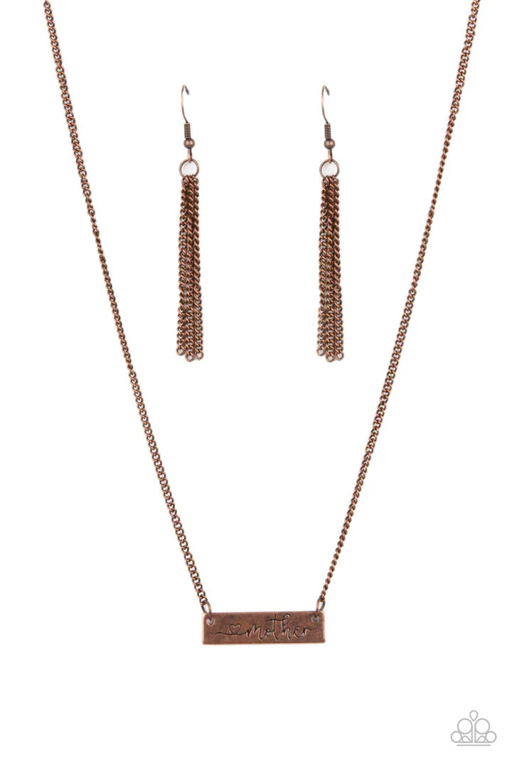 Stamped in a heart and the word, "Mother," an antiqued copper plate is suspended by a classic copper chain below the collar, creating a whimsy sentimental pendant. Features an adjustable clasp closure.