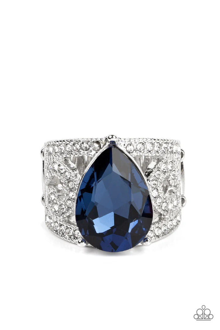 An oversized teardrop gem in the Pantone® of Polar Night embellishes the center of a regal, filigree-filled band dotted in glassy white rhinestones, invoking a royal radiance atop the finger. Features a stretchy band for a flexible fit.