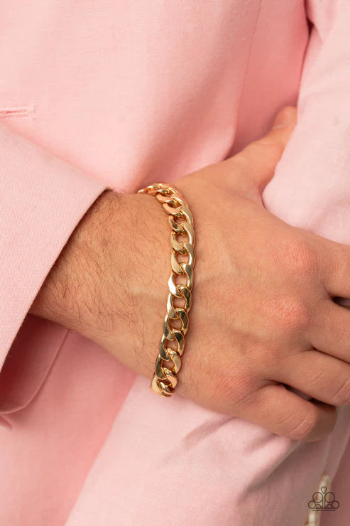A thick gold strand of curb chain drapes around the wrist for a bold industrial look. Features an adjustable clasp closure.