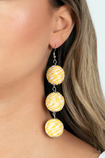 A woven collection of Illuminating and white crepe-like strings ornately wraps around three hanging beads, reminiscent of decorative party lanterns. Earring attaches to a standard fishhook fitting.
