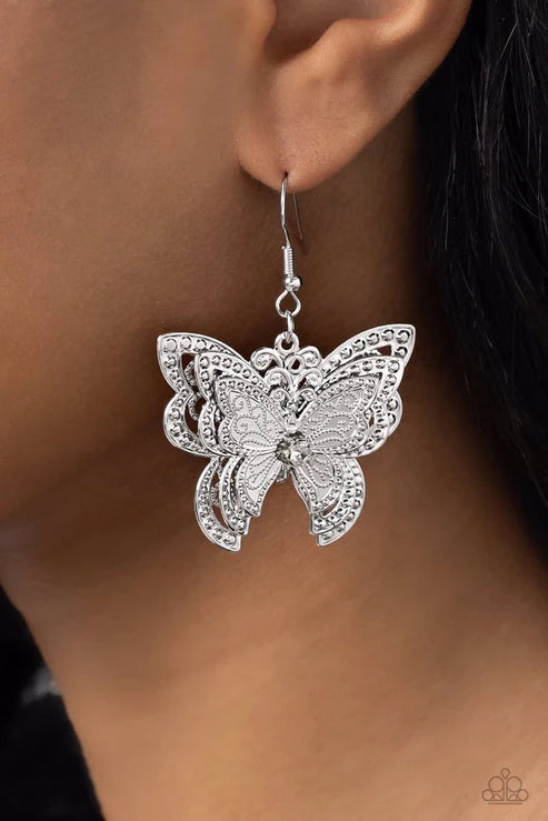 A whimsical 3D butterfly, with ornate details and textures, elegantly increases in size to create a three-layered high-sheen silver lure. A white gem is nestled at the center of the butterfly's wings, creating an additional hint of sparkle. Earring attaches to a standard fishhook fitting.