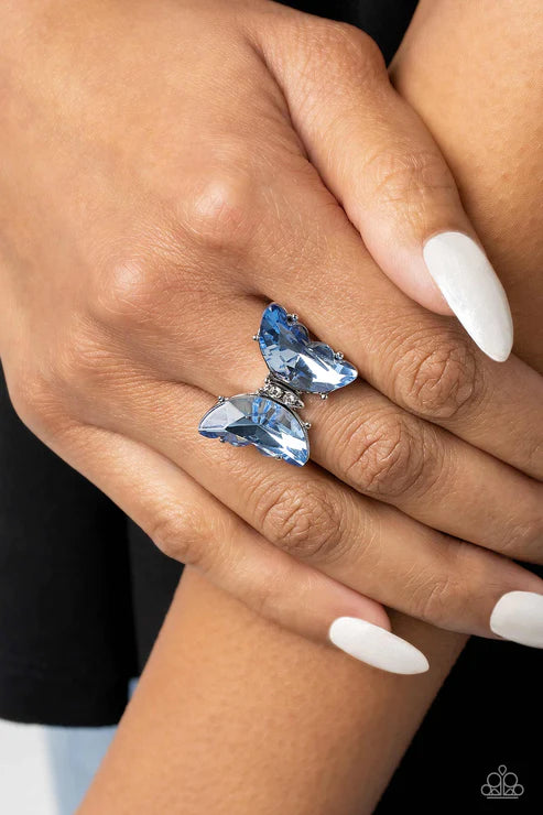 Featuring a faceted crystal finish, a pair of glittery blue gems adorns the scalloped wings of a rhinestone-bodied silver butterfly atop the finger for an eye-catching finish. Features a stretchy band for a flexible fit.