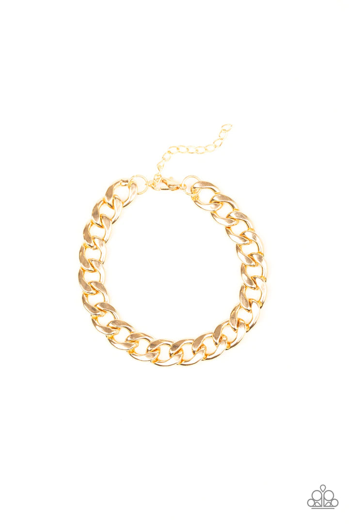 A thick strand of gold curb link chain is wrapped around the wrist for a classic look. Features an adjustable clasp closure.