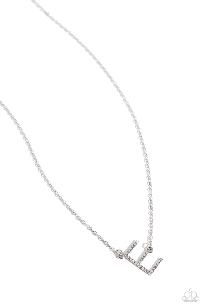 Embossed with dainty iridescent rhinestones, a silver letter "E" hovers below the collar from a dainty silver chain, for a sentimentally simple design. Features an adjustable clasp closure. Due to its prismatic palette, color may vary.