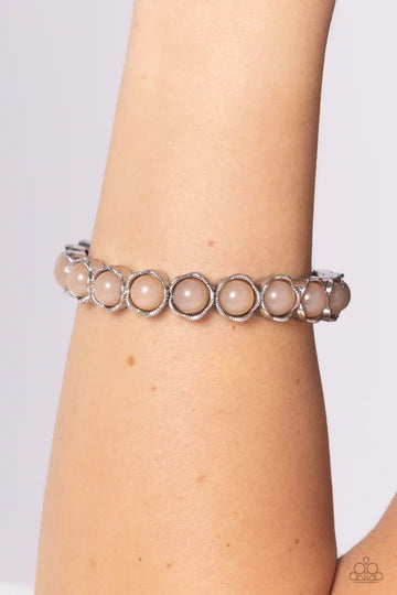 Textured silver petals fold around dewy brown beads along stretchy bands, resulting in a flowery pop of color around the wrist.