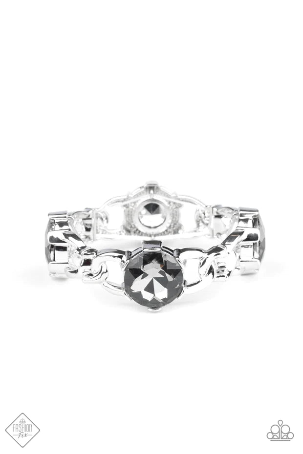 Featuring glistening oversized silver chain-link fittings, exaggerated smoky gem encrusted frames are threaded along a stretchy band around the wrist for a dramatic look.
