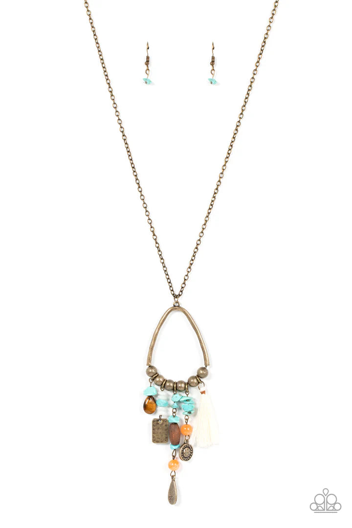 Infused with a multicolored collection of natural stone beads and pebbles, stacks of textured brass charms and mismatched wooden beads create earthy tassels at the bottom of a brass beaded teardrop frame. Enhanced with a shiny white threaded tassel, the whimsical fringe swings from the bottom of an extended brass chain for a seasonal finish. Features an adjustable clasp closure.