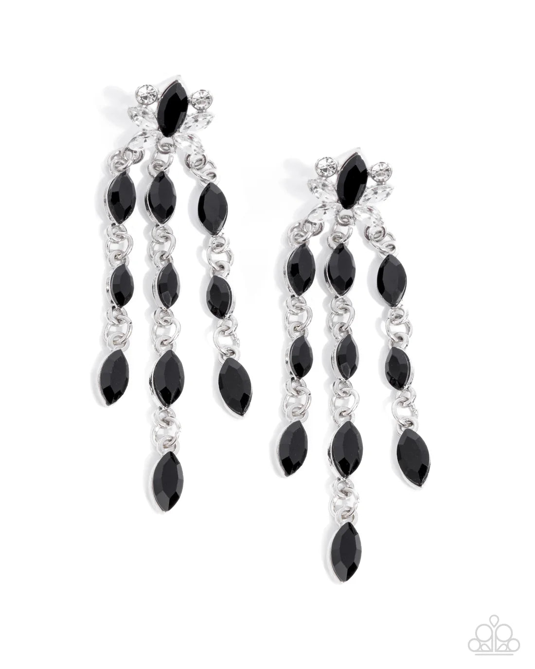 A trio of marquise-cut black gem-embellished chain strands are suspended and taper from a glittery explosion of round and marquise-cut white and black gems in varying sizes for a light-catching lure of luxury. Earring attaches to a standard post fitting.