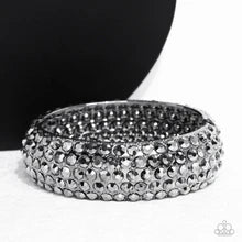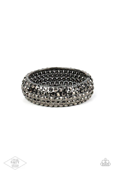 Featuring a must-have hinged closure, the front of a thick gunmetal bangle is encrusted in row after row of smoky hematite rhinestones. The cuff-like bangle features a slight beveled surface, bringing the blinding sparkle to the forefront of this show-stopping masterpiece. Sold as one individual bracelet.