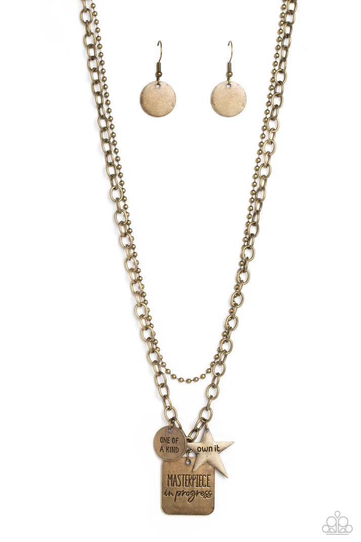 Featuring three inspirational pendants, a brass star, circle, and square fall along a brass chain. The star features the phrase "own it," the circle features the phrase "one of a kind," and the square pendant features the phrase "masterpiece in progress." Hanging just above the inspiring collection, a brass ball chain creates an additional layer to the monochromatic design. Features an adjustable clasp closure.
