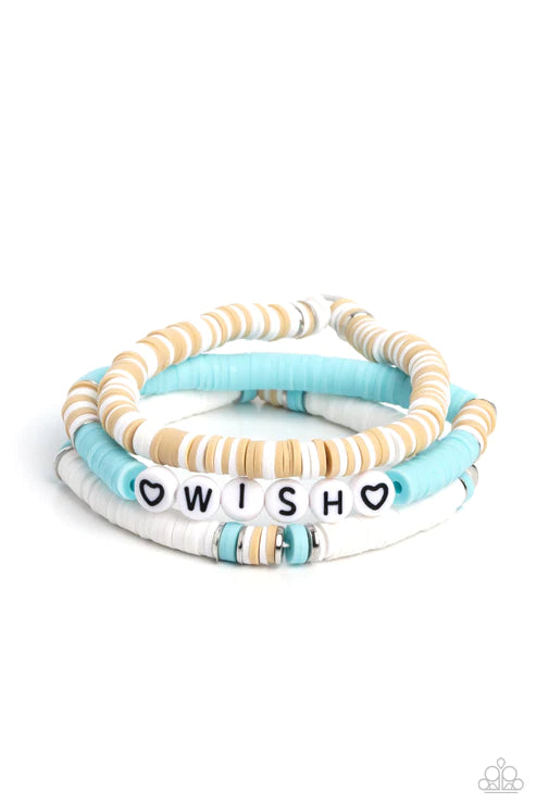 Varying in multicolored shades, tan, light blue, and white clay discs pair with shiny silver disc beads and accents creating seasonal layers across the wrist. Featured on one of the light blue bracelets, white beads stamped with black lettering spell out the word "wish," while black heart silhouettes stamped in the same white beads frame the inspirational phrase for a wistful finish.