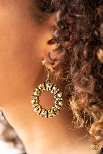 An explosion of round aurum rhinestones and aurum rhinestone dotted brass bars coalesce into a smoldering hoop. Earring attaches to a standard fishhook fitting.