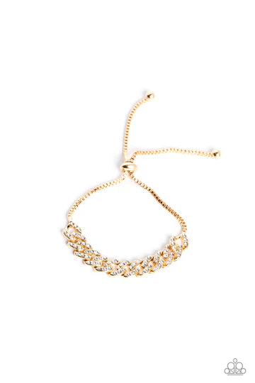 Falling from a rounded gold snake chain, glistening gold links, encrusted with dainty white rhinestones, join across the wrist, creating a bold bracelet. Features an adjustable sliding bead closure.