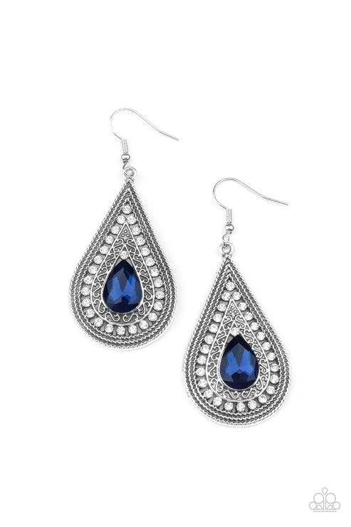 An elaborate silver teardrop frame, adorned with a rope-like border and dainty white rhinestones, encases a brilliant blue teardrop gem creating a stunningly captivating lure. Earring attaches to a standard fishhook fitting.