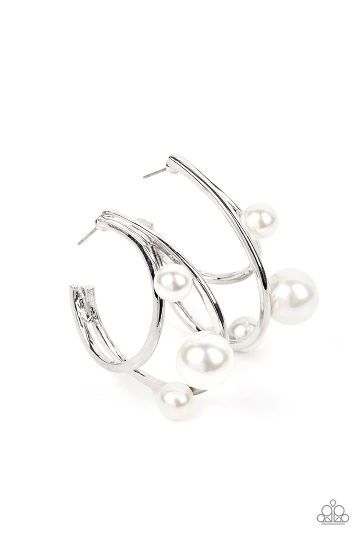Two dainty silver bars curve into dazzling double hoops, creating asymmetrical framework. Varying sizes of classic pearls dot the edges of the classic hoops, creating the illusion of floating pearl accents. Earring attaches to a standard post fitting. Hoop measures approximately 1 1/2" in diameter.