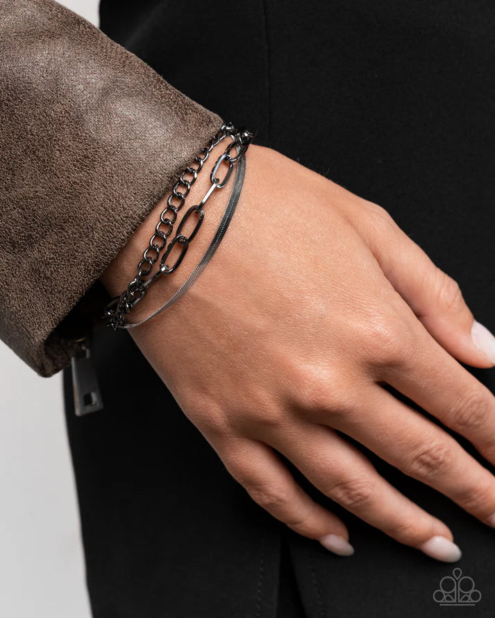 An intense display of mismatched gunmetal and silver chains, including a paperclip, classic, and herringbone chain, boldly layer around the wrist, creating an unmatched, industrial vibe. Features an adjustable clasp closure.