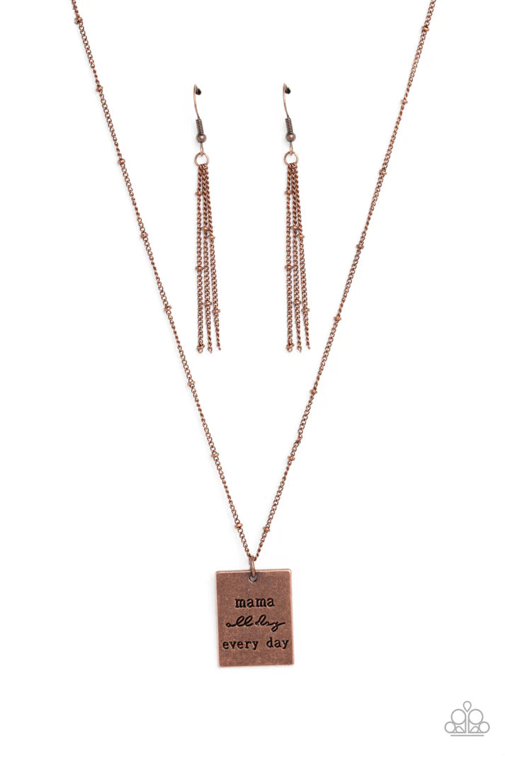 Infused with dainty copper studs on a dainty copper chain, a copper rectangular plate is stamped with the phrase "mama all day every day," for a monochromatic, minimalistic tribute. Features an adjustable clasp closure. Sold as one individual necklace. Includes one pair of matching earrings.