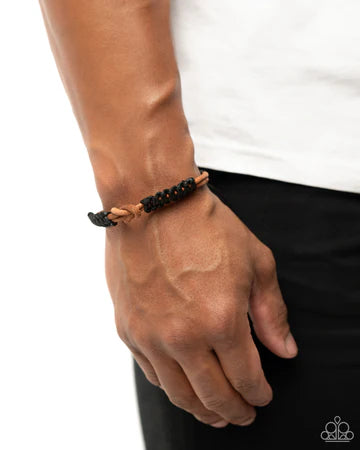 Wrapped and knotted in shiny black corded accents, strands of brown suede cording delicately knots around the wrist for a nautical inspired look. Features an adjustable sliding knot closure.