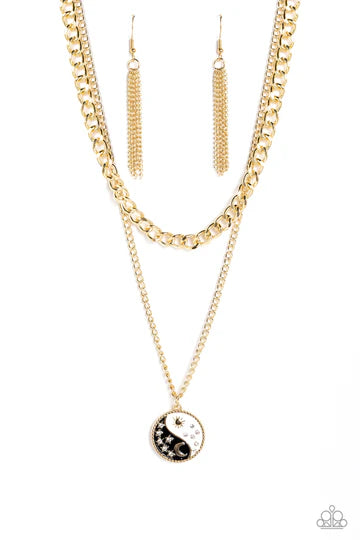 Featuring a yin-yang design, a gold moon with rhinestone-dusted stars rests on the black curve, while a gold sun with rhinestone beams of light rests on the white curve for a balanced, studded display down the neckline. A gold curb chain hangs above the pendant for a touch of gritty sheen. Features an adjustable clasp closure.