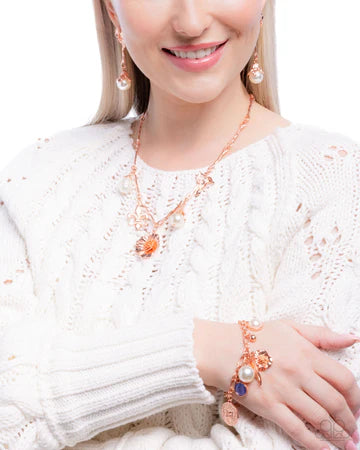 Infused along a shiny copper paperclip and round alternating chain, a collection of vintage charms, including a baroque white pearl, a shiny copper fleur-de-lis-embellished pendant, a blue cat's eye stone in a shiny copper circular fitting, a shiny copper feather, a solitaire shiny copper bead, a shiny copper-studded flower, and a white pearl pressed in a circular frame create a dynamic display of interest along the wrist. Features an adjustable clasp closure.