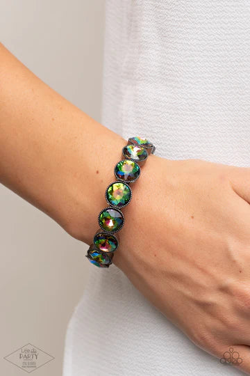 Faceted oil spill gems are pressed into sleek gunmetal frames. The glittery frames are threaded along stretchy bands, creating a glamorous look around the wrist. Sold as one individual stretchy brand bracelet.