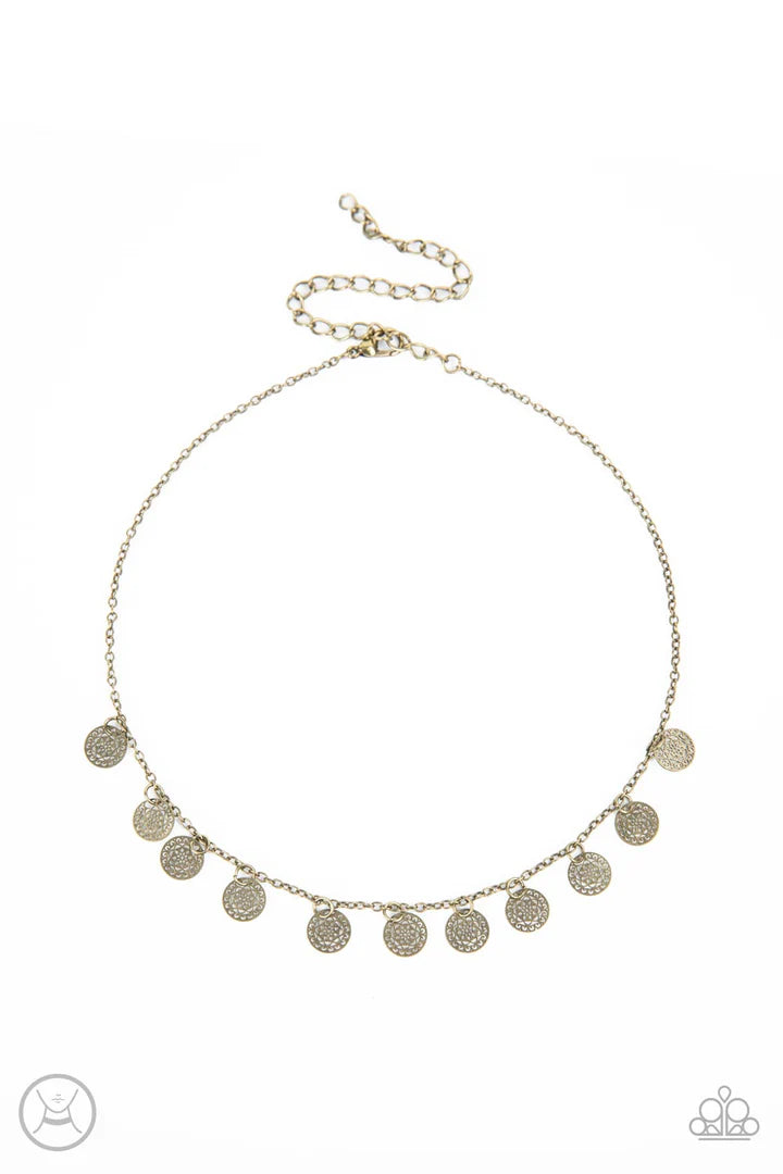 A dainty collection of mandala-like brass discs swings from an antiqued brass chain, creating a rustic radiance around the neck. Features an adjustable clasp closure.