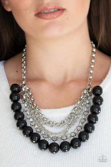 A collision of mismatched silver chains layer below the collar. Oversized black beads dangle from the lowermost chain, creating a dramatically refined fringe for a statement-making finish. Features an adjustable clasp closure. Sold as one individual necklace. Includes one pair of matching earrings.