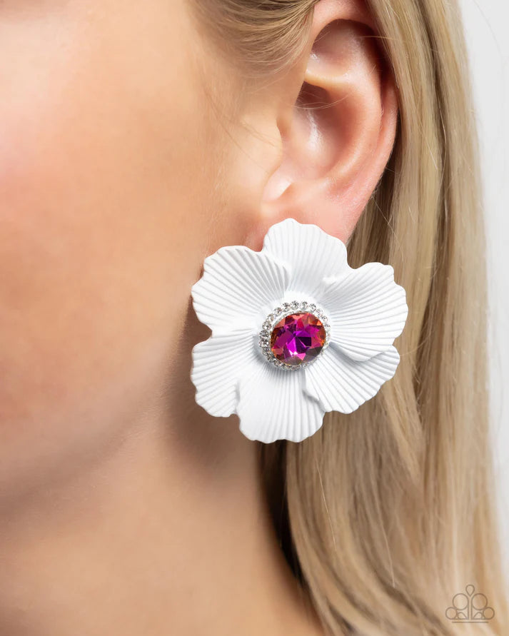 Featuring pink UV-shimmery gem centers, crimped white-painted petals bloom out atop the ear for a whimsically wondrous look. A border of white rhinestones frames the UV centerpiece for additional eye-catching shimmer. Earring attaches to a standard post fitting.