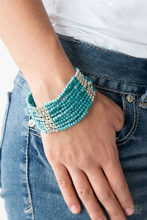 Joined together with metallic fittings, countless turquoise seed beads are threaded along stretchy elastic bands. Sections of dainty silver beads are sprinkled along the colorful layers, adding hints of shimmer to the seasonal palette.