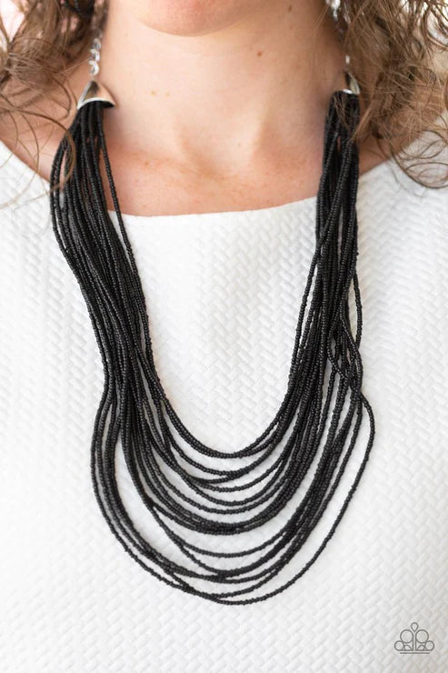 Infused with two bold silver fittings, row after row of shiny black seed beads layer across the chest for a seasonal fashion. Features an adjustable clasp closure.