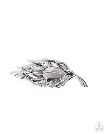 Dotted with green, green iridescent, malachite, and malachite iridescent rhinestones, curly bands of silver flair around an upside-down UV-shimmery green teardrop gem for a peacock-inspired polished centerpiece. Brooch measures approximately 1 3/4" in length and 3 1/2" in width. Due to its prismatic palette, color may vary.