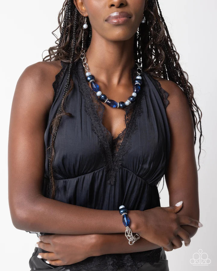 Connected to glistening silver chains, a collection of glossy Winter Sky pearls, Montana abstract pearls, studded silver discs, and faceted clear navy oval beads pattern around the wrist on elastic stretchy bands for a prolifically promising display. Features an adjustable clasp closure.