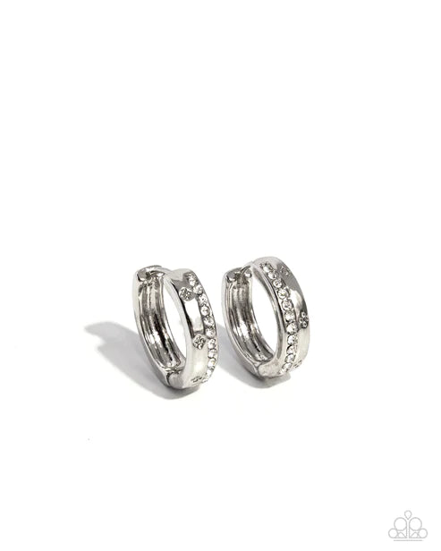 Two silver bands, one thin with a row of dazzling white rhinestones and the other thick with sporadically placed white rhinestones pair together to make a polished hoop. Earring attaches to a standard hinge closure fitting. Hoop measures approximately 3/4" in diameter.