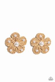 Pearls in varying sizes, sporadically dot the front of a tan straw-like woven floral centerpiece for a beachy flair. Earring attaches to a standard post fitting.