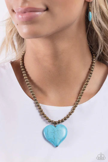 An oversized turquoise stone heart pendant swings from the bottom of a textured brass beaded display below the collar for a flirtatiously earthy fashion. Features an adjustable clasp closure. As the stone elements in this piece are natural, some color variation is normal.