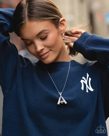 Embellished in glistening white rhinestones, a duo of crossed silver baseball bats over a silver baseball glides below the neckline from a thin silver snake chain for a homerun haute look. Features an adjustable clasp closure.