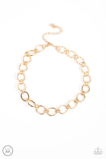 Imperfectly shaped gold circles link together around the neck for a gritty industrial statement. Features an adjustable clasp closure.